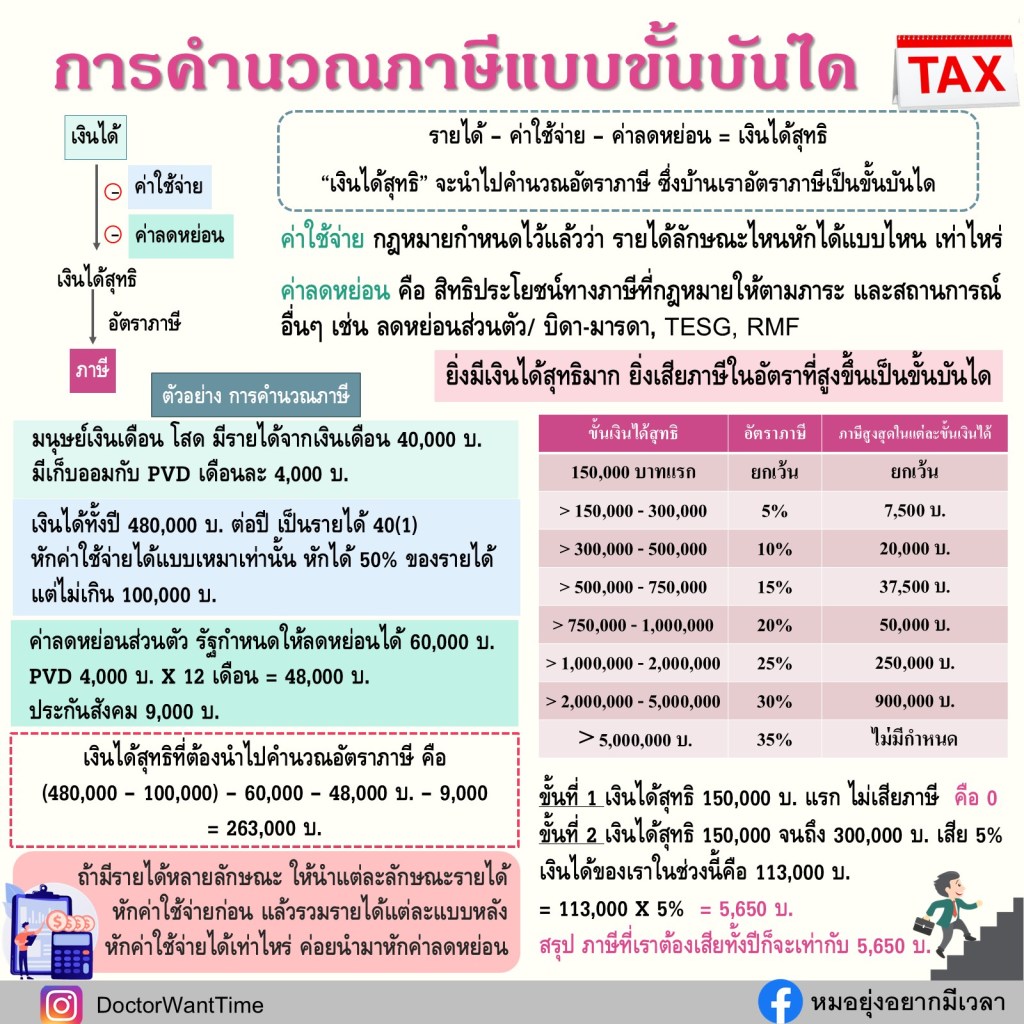 • ภาษีที่ต้องเสีย = เงินได้สุทธิแต่ละช่วง × อัตราภาษีของช่วงนั้น