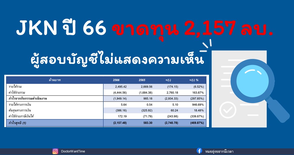 JKN งบปี 66 ขาดทุน 2,157 ลบ. และผู้สอบบัญชีไม่แสดงความเอ่านเพิ่มเติม “JKN ปี 66 ขาดทุน 2 พันล้าน ผู้สอบบัญชีไม่แสดงความเห็น”